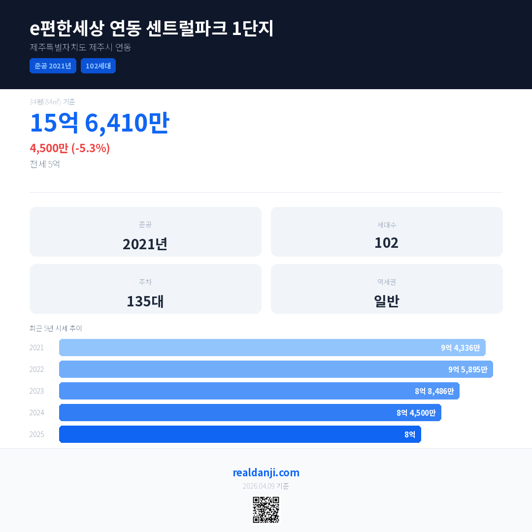 e편한세상 연동 센트럴파크 1단지 국민평형 기준 2025년 평균 거래가는 8억으로, 전년 대비 5.3% 하락 했습니다.