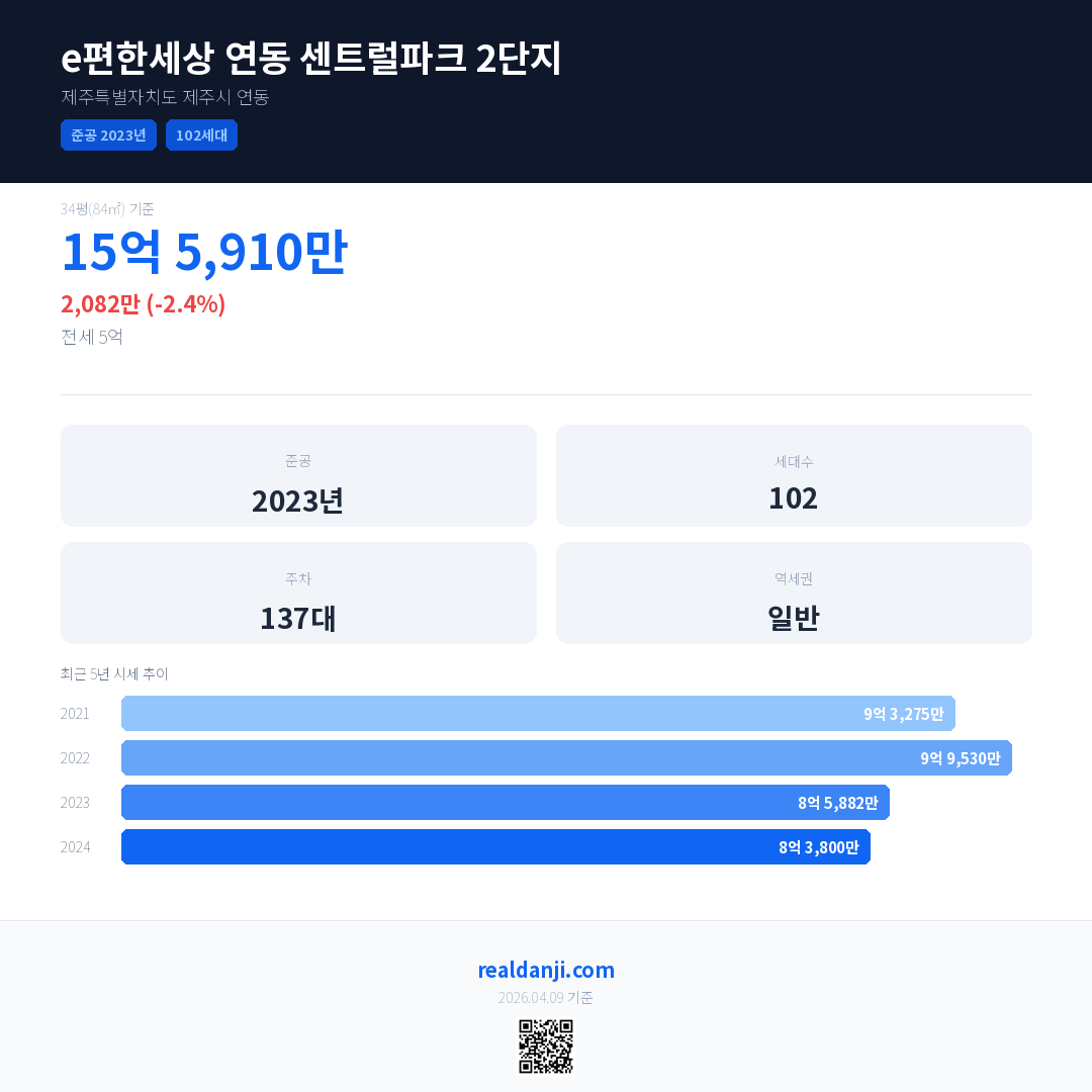 e편한세상 연동 센트럴파크 2단지은(는) 2023년에 준공되었으며, 현재 3년차입니다. 총 102세대 규모입니다.