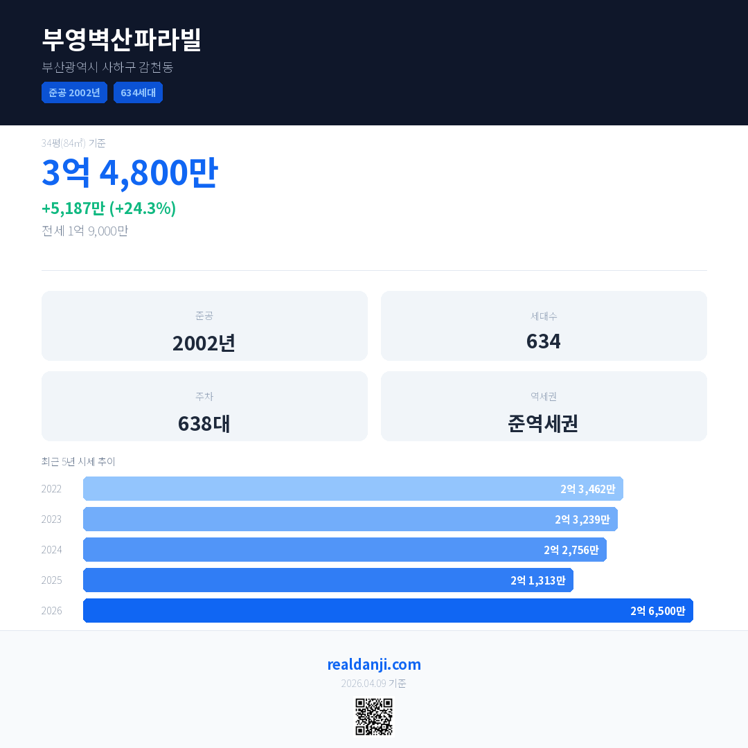 부영벽산파라빌 국민평형 기준 2026년 평균 거래가는 2억 6,500만으로, 전년 대비 24.3% 상승 했습니다.