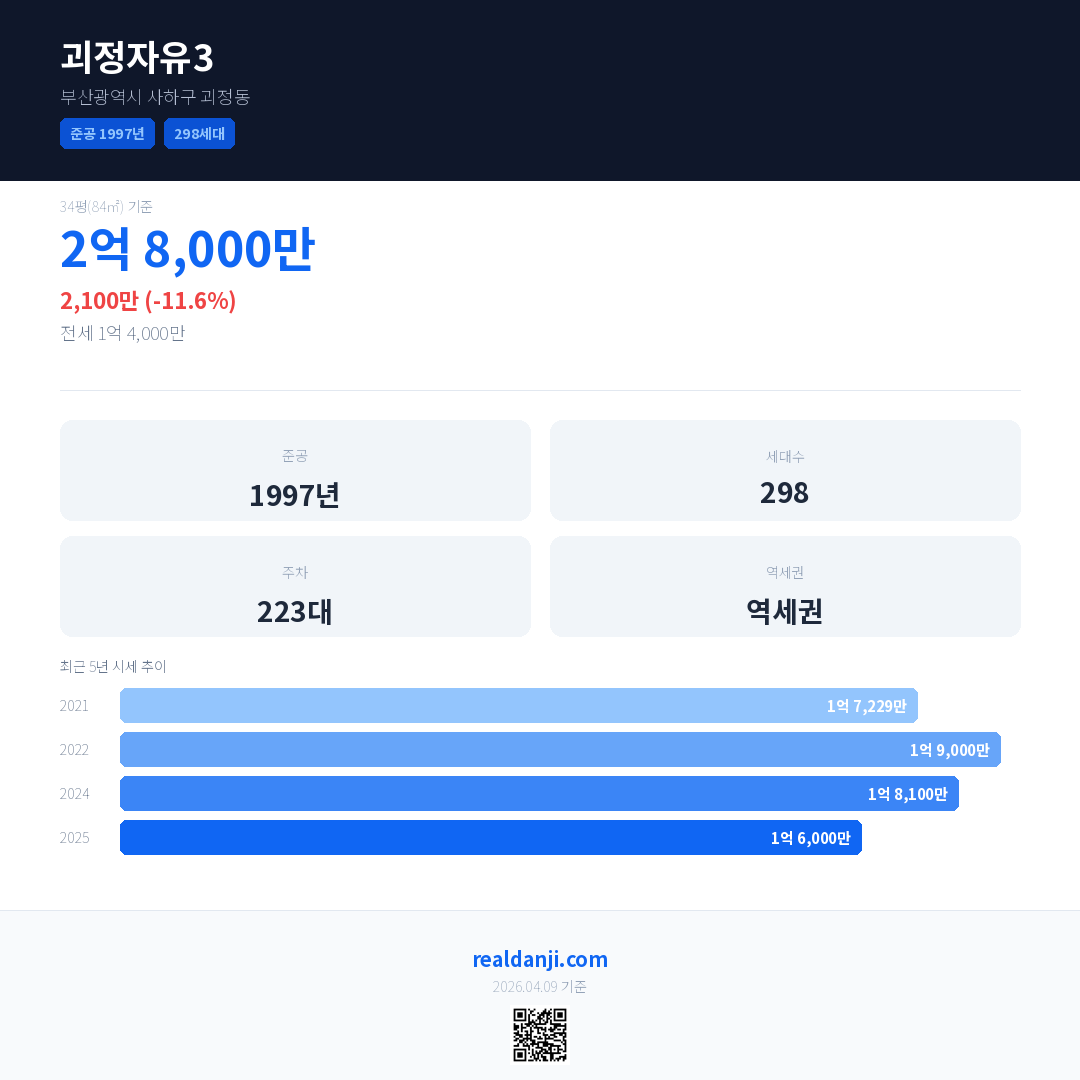 괴정자유3 국민평형 기준 2025년 평균 거래가는 1억 6,000만으로, 전년 대비 11.6% 하락 했습니다.