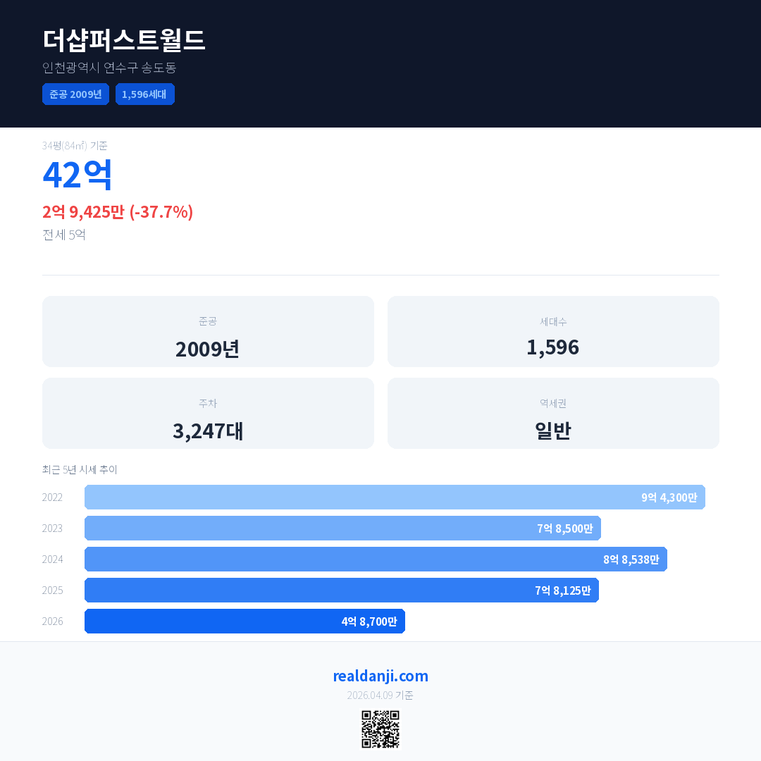 더샵퍼스트월드 국민평형 기준 2026년 평균 거래가는 4억 8,700만으로, 전년 대비 37.7% 하락 했습니다.