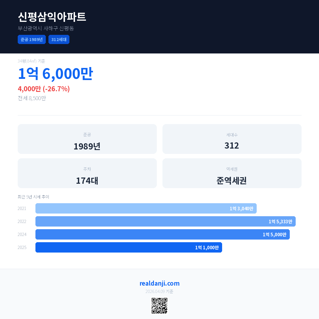 신평삼익아파트 최근 거래가는 1억 6,000만입니다. (2026-01)