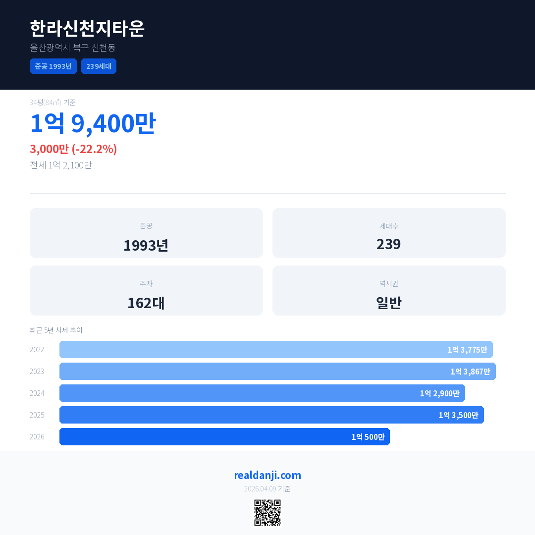 한라신천지타운 국민평형 기준 2026년 평균 거래가는 1억 500만으로, 전년 대비 22.2% 하락 했습니다.
