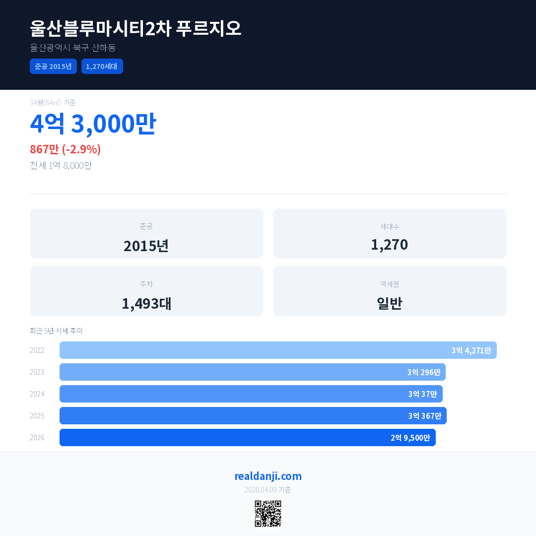 울산블루마시티2차 푸르지오 최근 거래가는 4억 3,000만입니다. (2026-03)