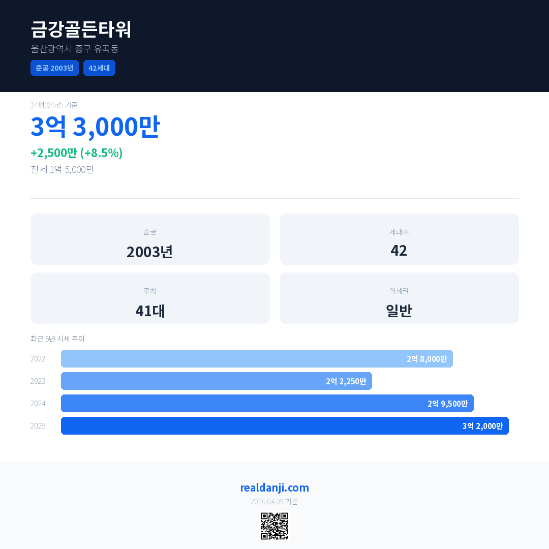 금강골든타워 국민평형 기준 2025년 평균 거래가는 3억 2,000만으로, 전년 대비 8.5% 상승 했습니다.