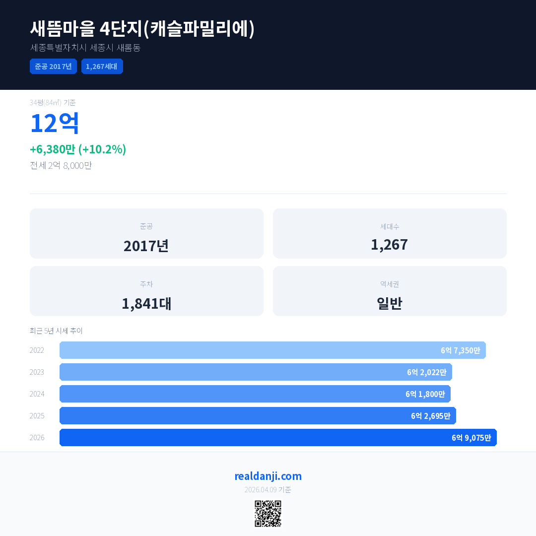 새뜸마을 4단지(캐슬파밀리에) 국민평형 기준 2026년 평균 거래가는 6억 9,075만으로, 전년 대비 10.2% 상승 했습니다.