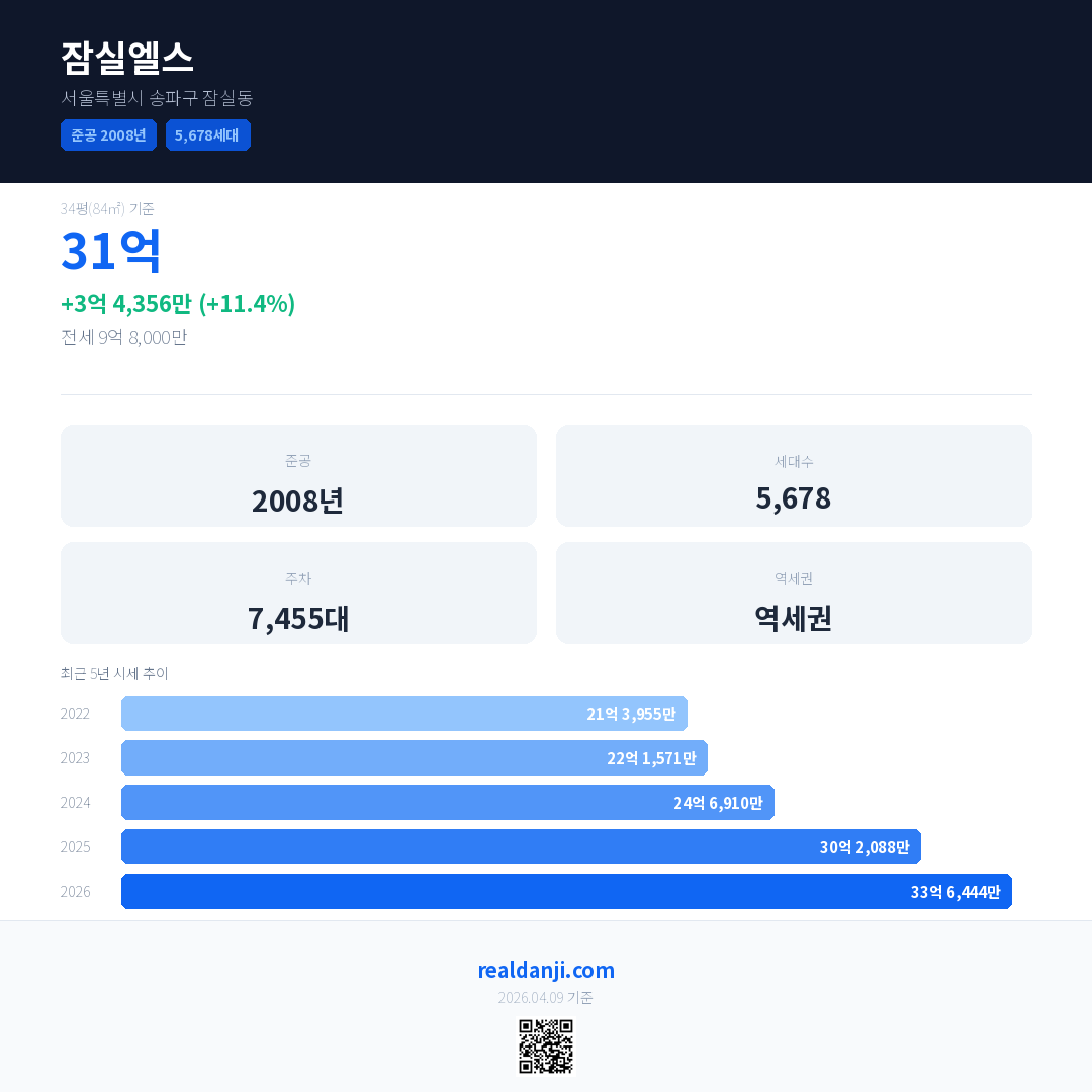 잠실엘스 국민평형 기준 2026년 평균 거래가는 33억 6,444만으로, 전년 대비 11.4% 상승 했습니다.