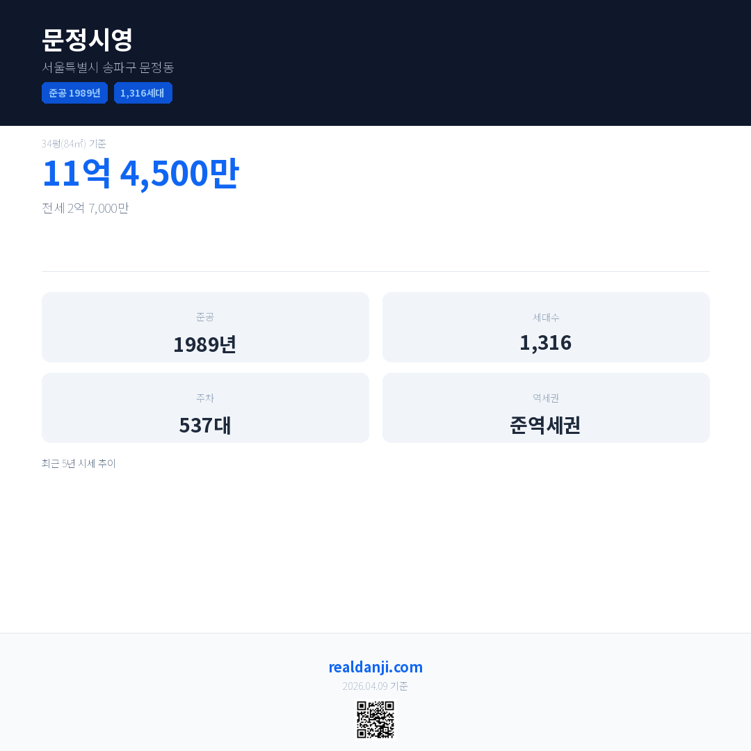 문정시영은(는) 1989년에 준공되었으며, 현재 37년차입니다. 총 1,316세대 규모입니다.