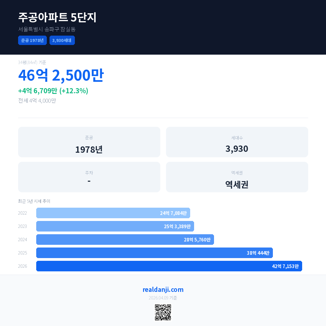 주공아파트 5단지 최근 거래가는 46억 2,500만입니다. (2026-03)