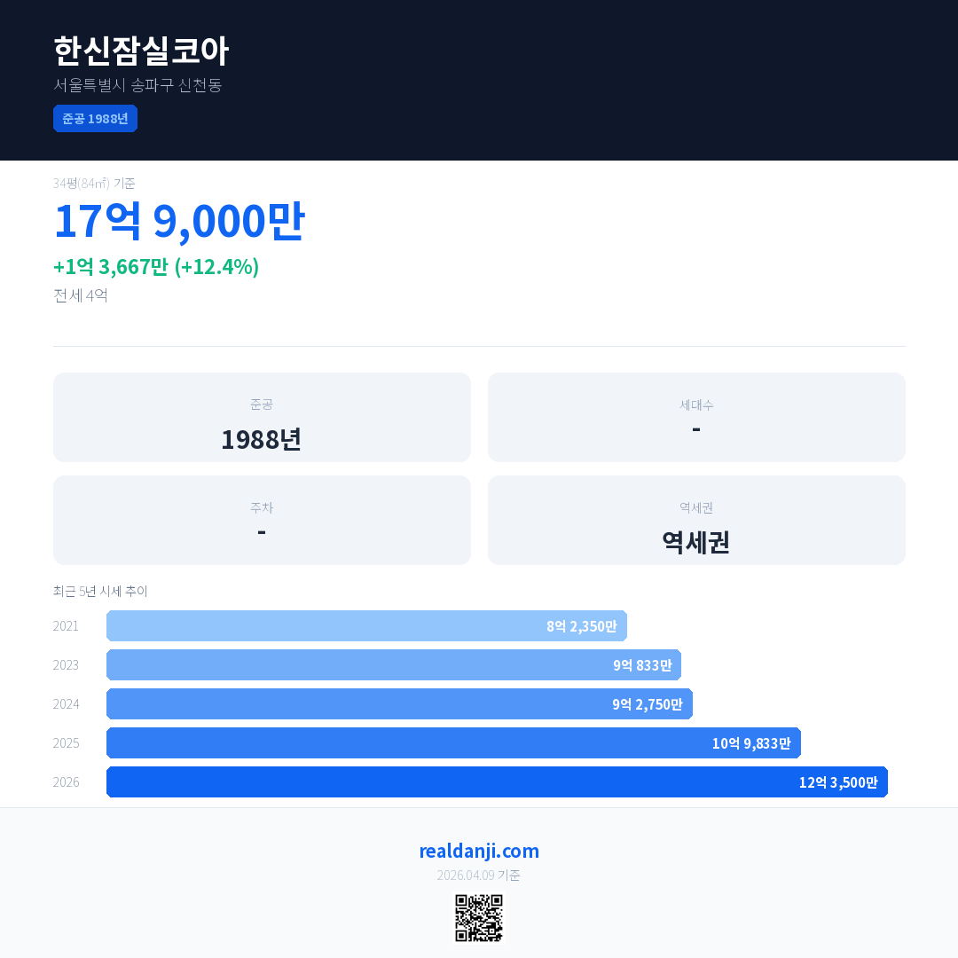 한신잠실코아 최근 거래가는 12억 3,000만입니다. (2026-03)