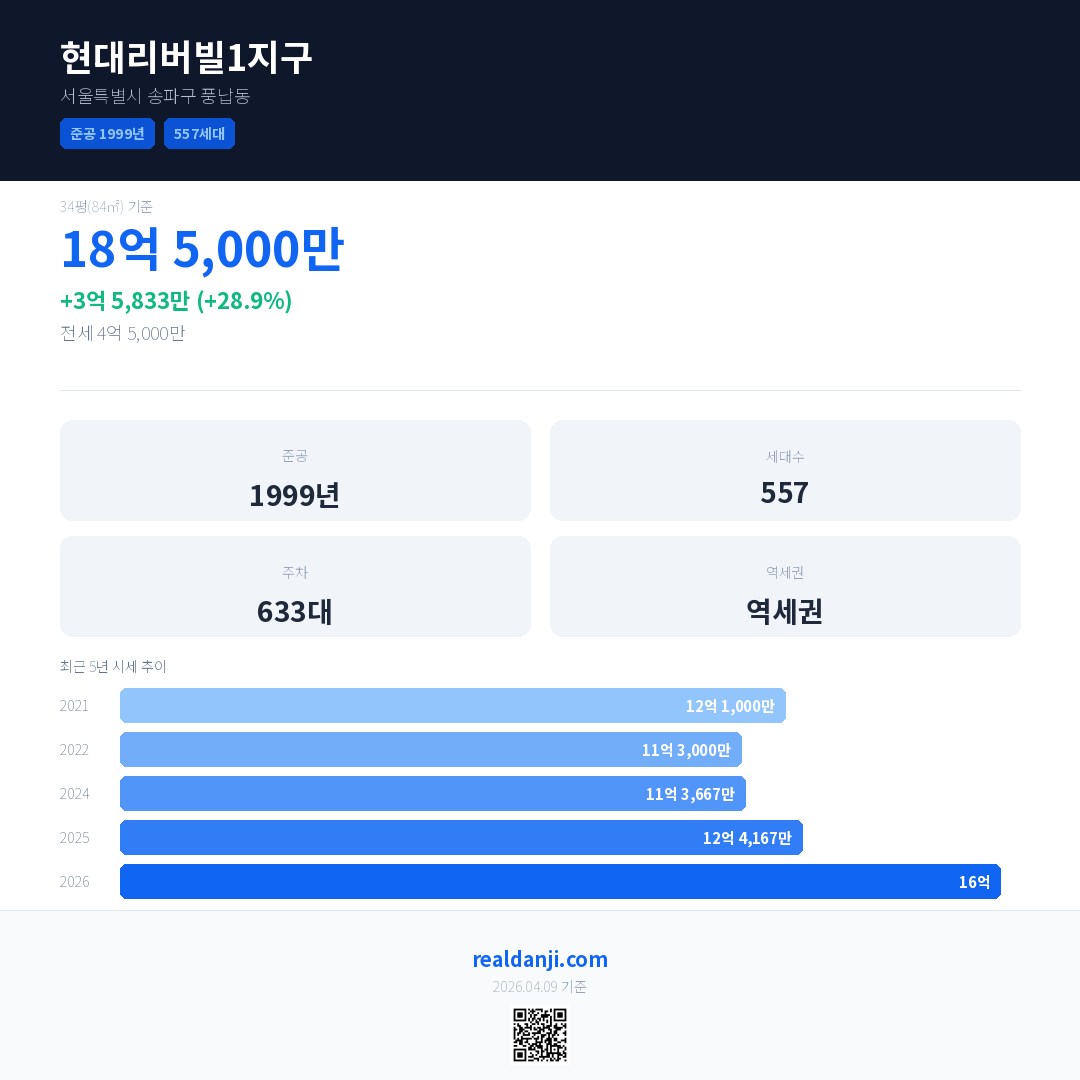 현대리버빌1지구 국민평형 기준 2026년 평균 거래가는 16억으로, 전년 대비 28.9% 상승 했습니다.