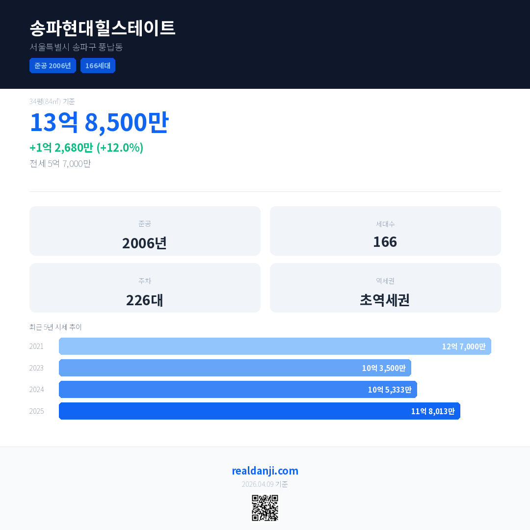 송파현대힐스테이트 국민평형 기준 2025년 평균 거래가는 11억 8,013만으로, 전년 대비 12.0% 상승 했습니다.