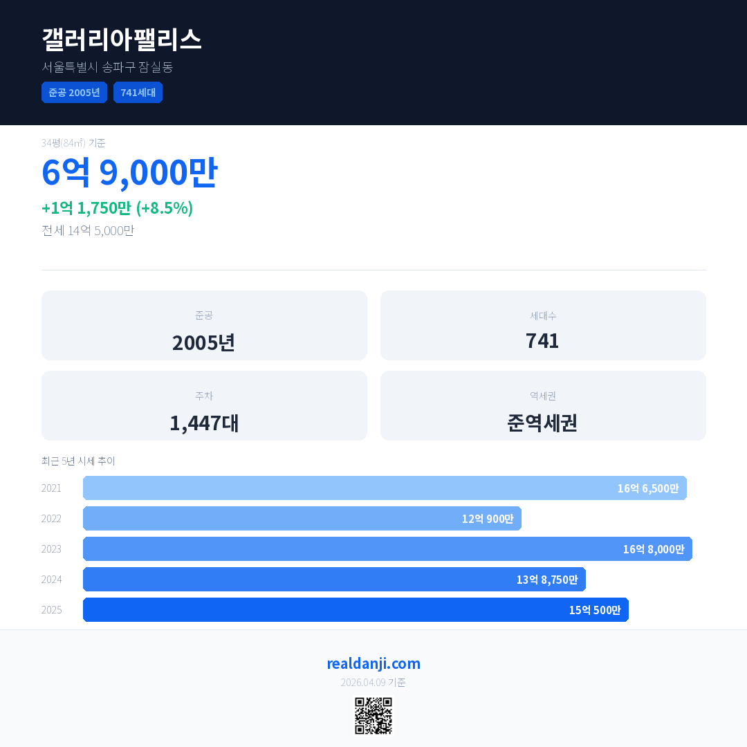 갤러리아팰리스 국민평형 기준 2025년 평균 거래가는 15억 500만으로, 전년 대비 8.5% 상승 했습니다.