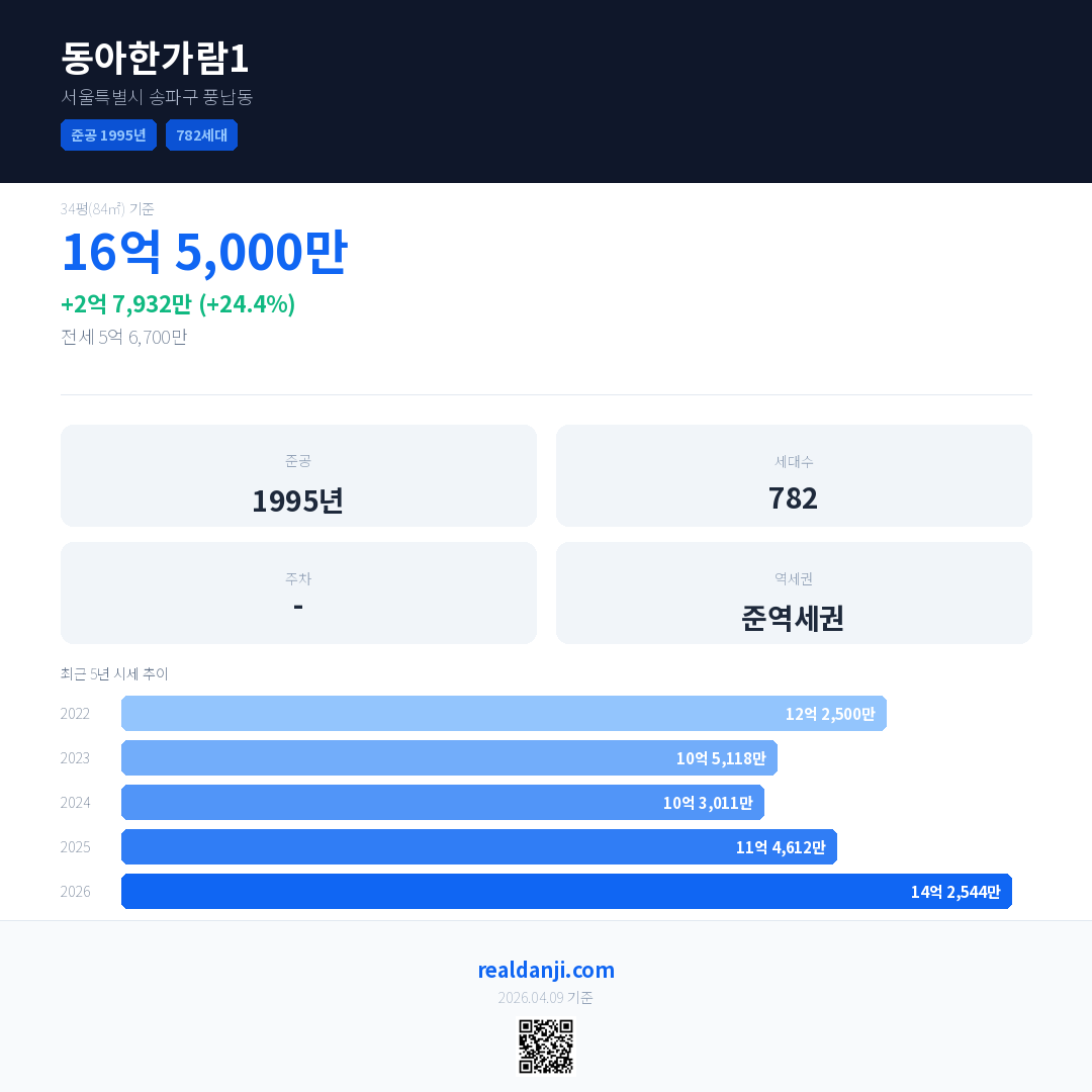 동아한가람1 국민평형 기준 2026년 평균 거래가는 14억 2,544만으로, 전년 대비 24.4% 상승 했습니다.