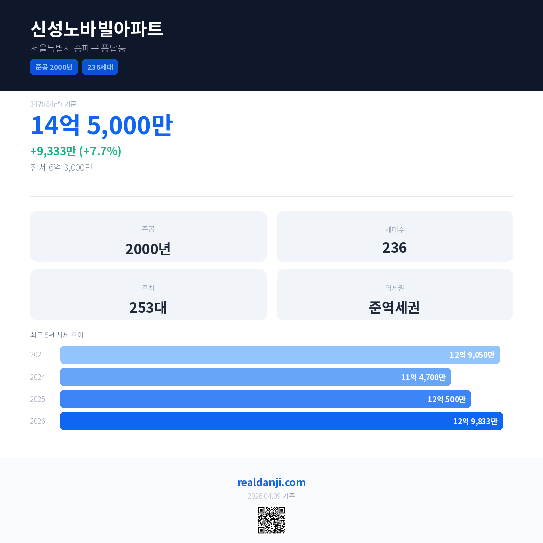 신성노바빌아파트 국민평형 기준 2026년 평균 거래가는 12억 9,833만으로, 전년 대비 7.7% 상승 했습니다.