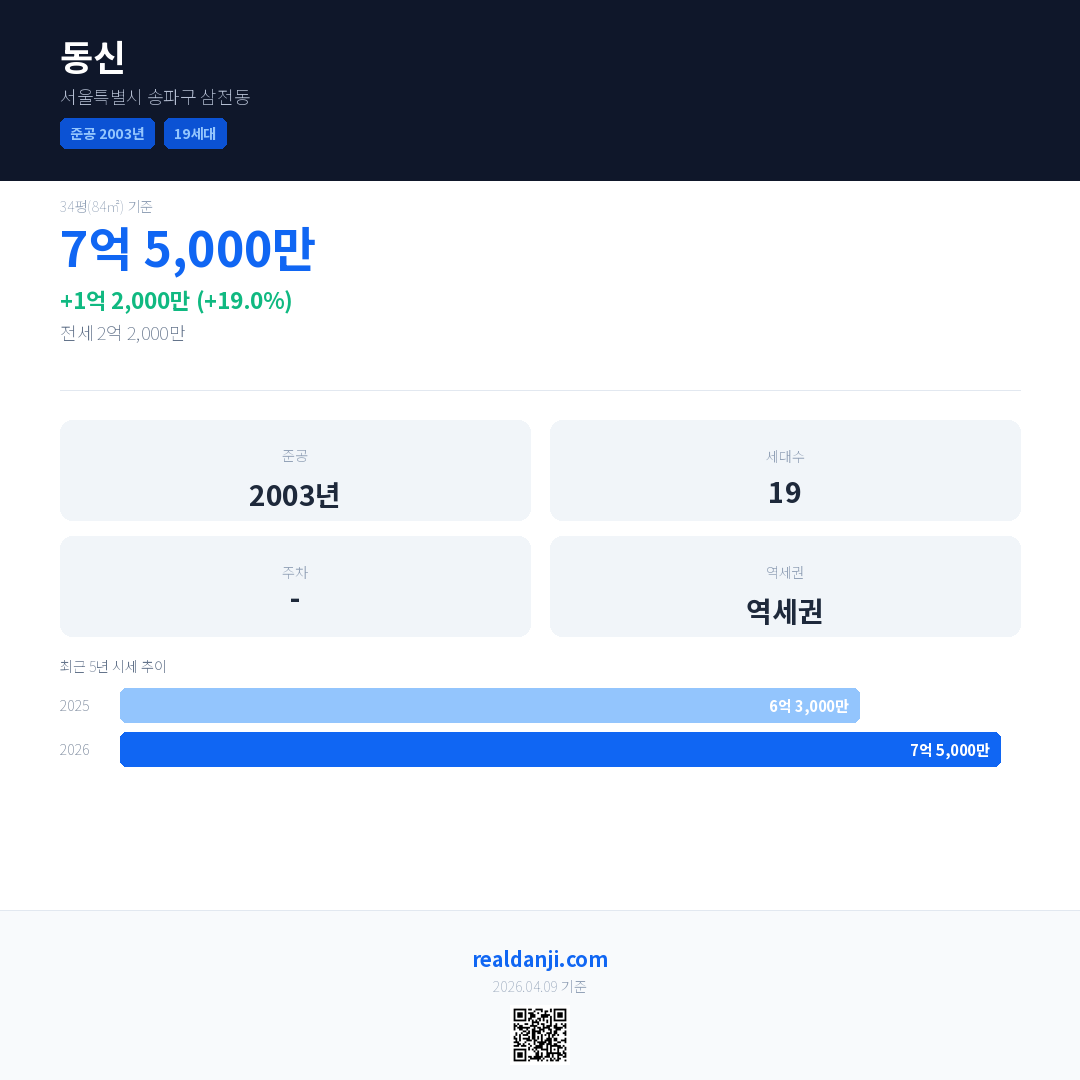 동신 최근 거래가는 7억 5,000만입니다. (2026-01)