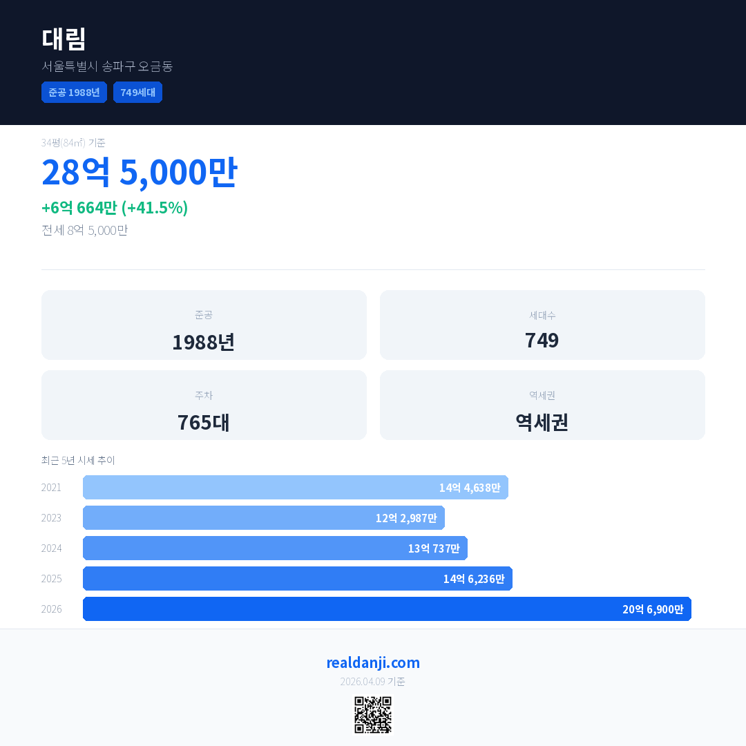 대림 국민평형 기준 2026년 평균 거래가는 20억 6,900만으로, 전년 대비 41.5% 상승 했습니다.