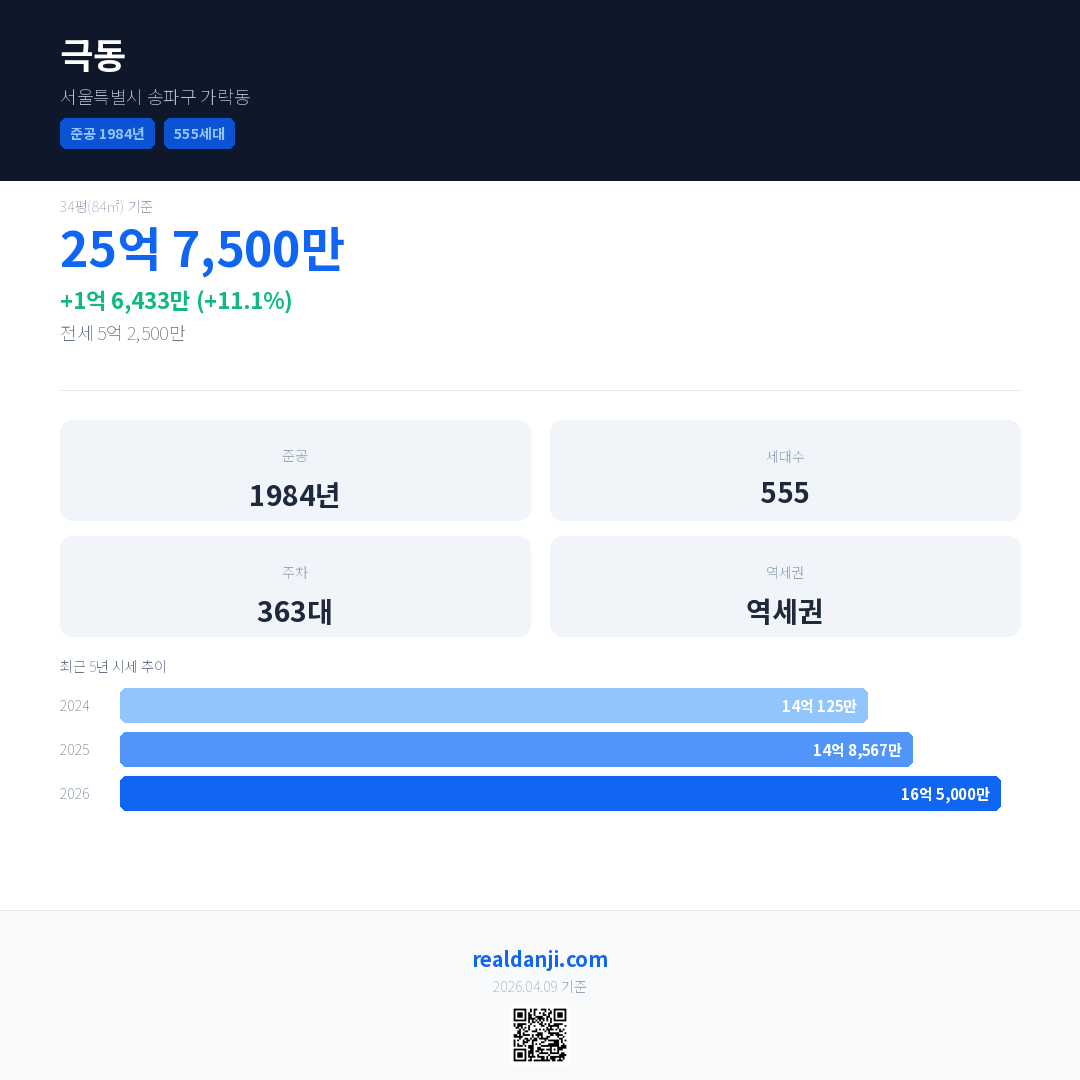 극동 국민평형 기준 2026년 평균 거래가는 16억 5,000만으로, 전년 대비 11.1% 상승 했습니다.