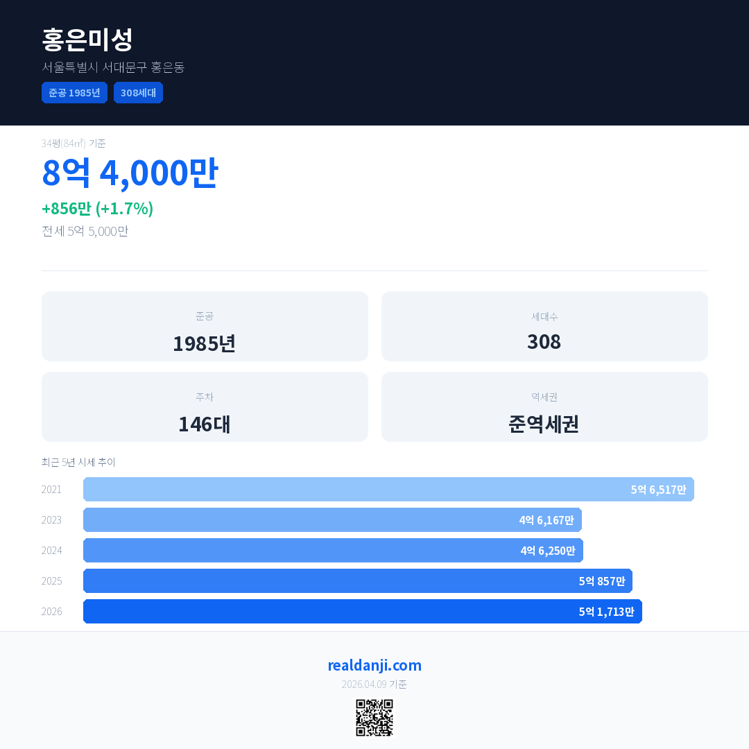 홍은미성 국민평형 기준 2026년 평균 거래가는 5억 1,713만으로, 전년 대비 1.7% 상승 했습니다.