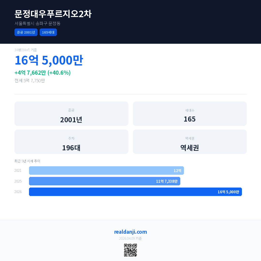 문정대우푸르지오2차 국민평형 기준 2026년 평균 거래가는 16억 5,000만으로, 전년 대비 40.6% 상승 했습니다.