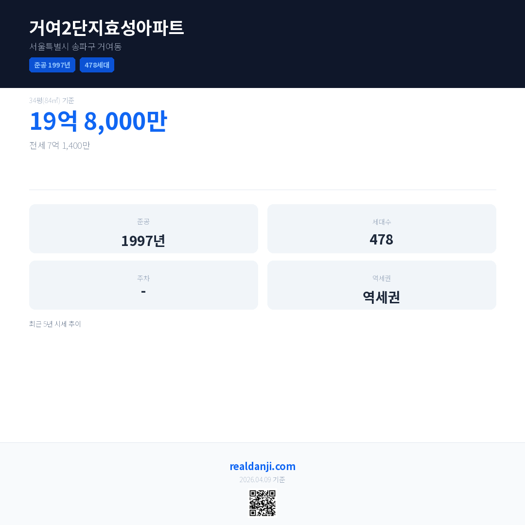 거여2단지효성아파트은(는) 1997년에 준공되었으며, 현재 29년차입니다. 총 478세대 규모입니다.