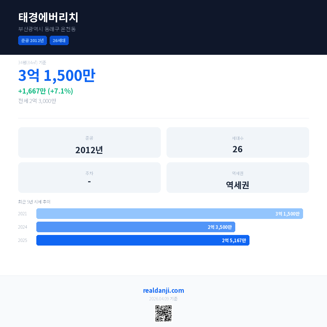 태경에버리치 국민평형 기준 2025년 평균 거래가는 2억 5,167만으로, 전년 대비 7.1% 상승 했습니다.