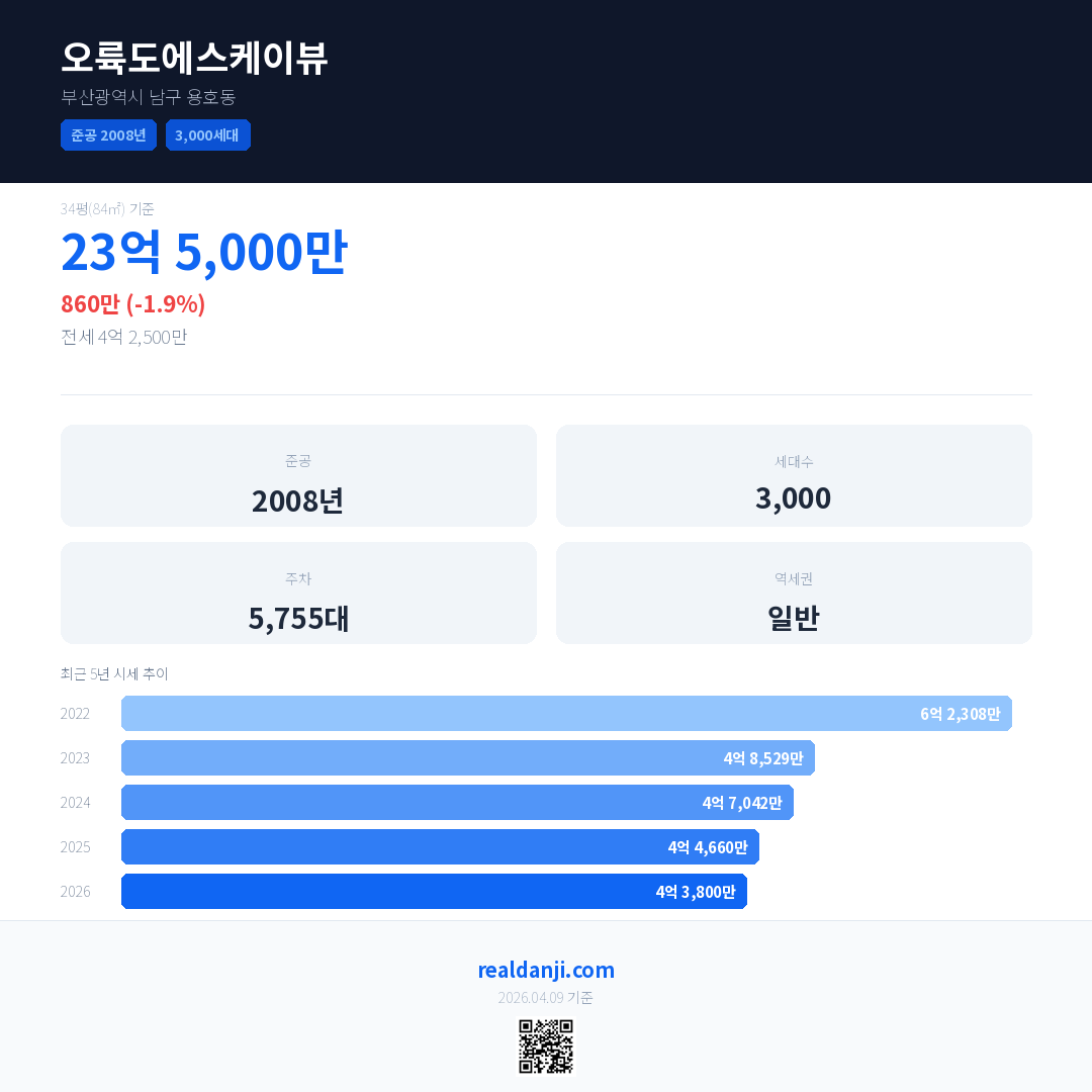 오륙도에스케이뷰 국민평형 기준 2026년 평균 거래가는 4억 3,800만으로, 전년 대비 1.9% 하락 했습니다.