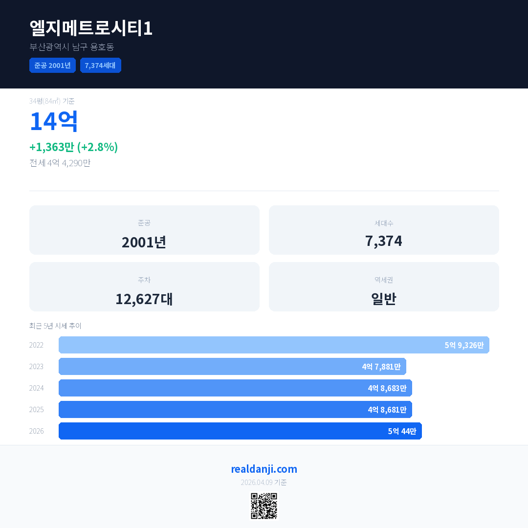 엘지메트로시티1 국민평형 기준 2026년 평균 거래가는 5억 44만으로, 전년 대비 2.8% 상승 했습니다.