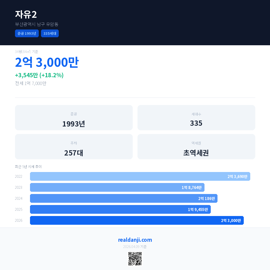 자유2 국민평형 기준 2026년 평균 거래가는 2억 3,000만으로, 전년 대비 18.2% 상승 했습니다.