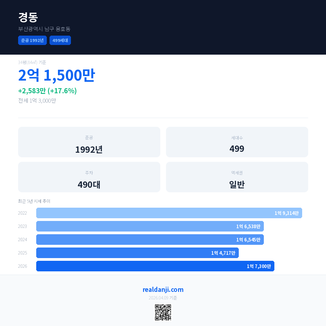 경동 국민평형 기준 2026년 평균 거래가는 1억 7,300만으로, 전년 대비 17.6% 상승 했습니다.