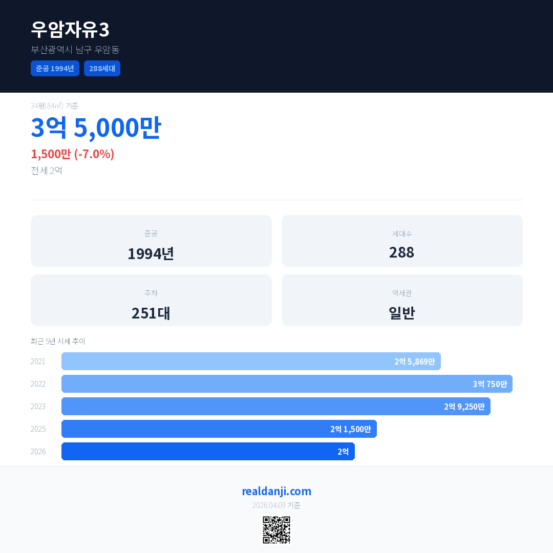 우암자유3 최근 거래가는 3억 5,000만입니다. (2026-02)