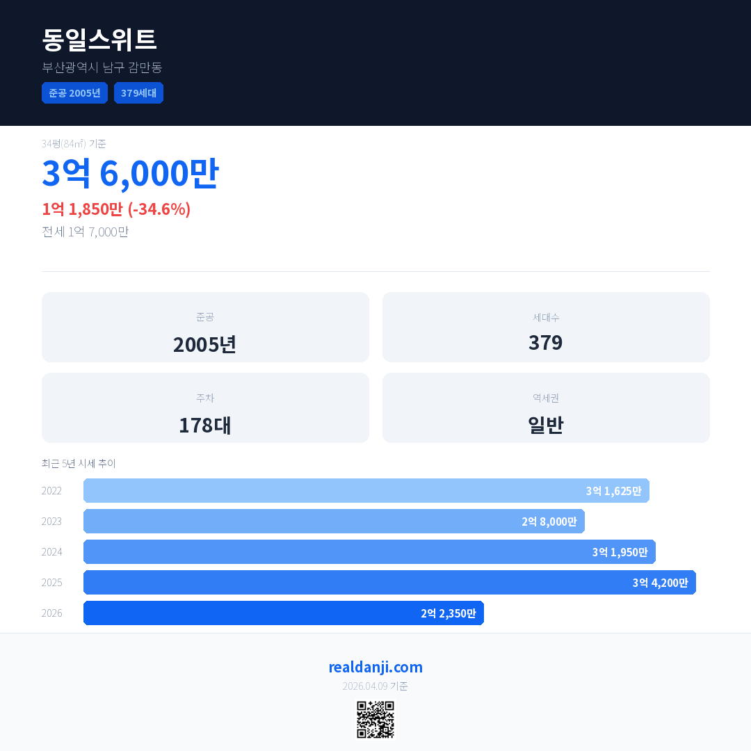 동일스위트 국민평형 기준 2026년 평균 거래가는 2억 2,350만으로, 전년 대비 34.6% 하락 했습니다.