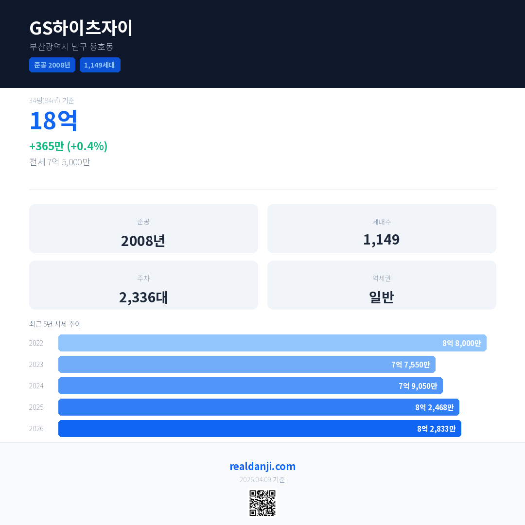 GS하이츠자이은(는) 2008년에 준공되었으며, 현재 18년차입니다. 총 1,149세대 규모입니다.