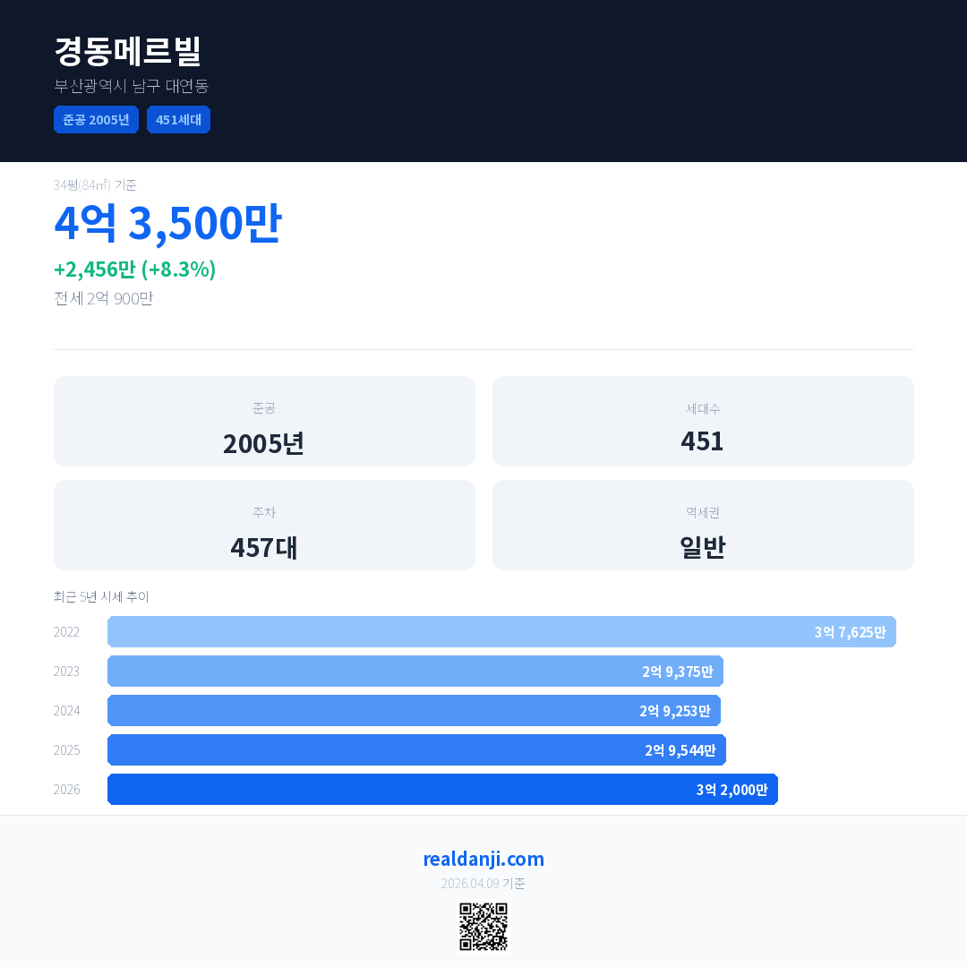 경동메르빌 국민평형 기준 2026년 평균 거래가는 3억 2,000만으로, 전년 대비 8.3% 상승 했습니다.