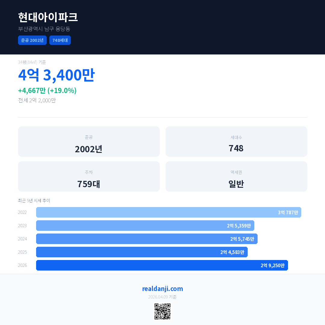 현대아이파크 최근 거래가는 4억 3,400만입니다. (2026-03)