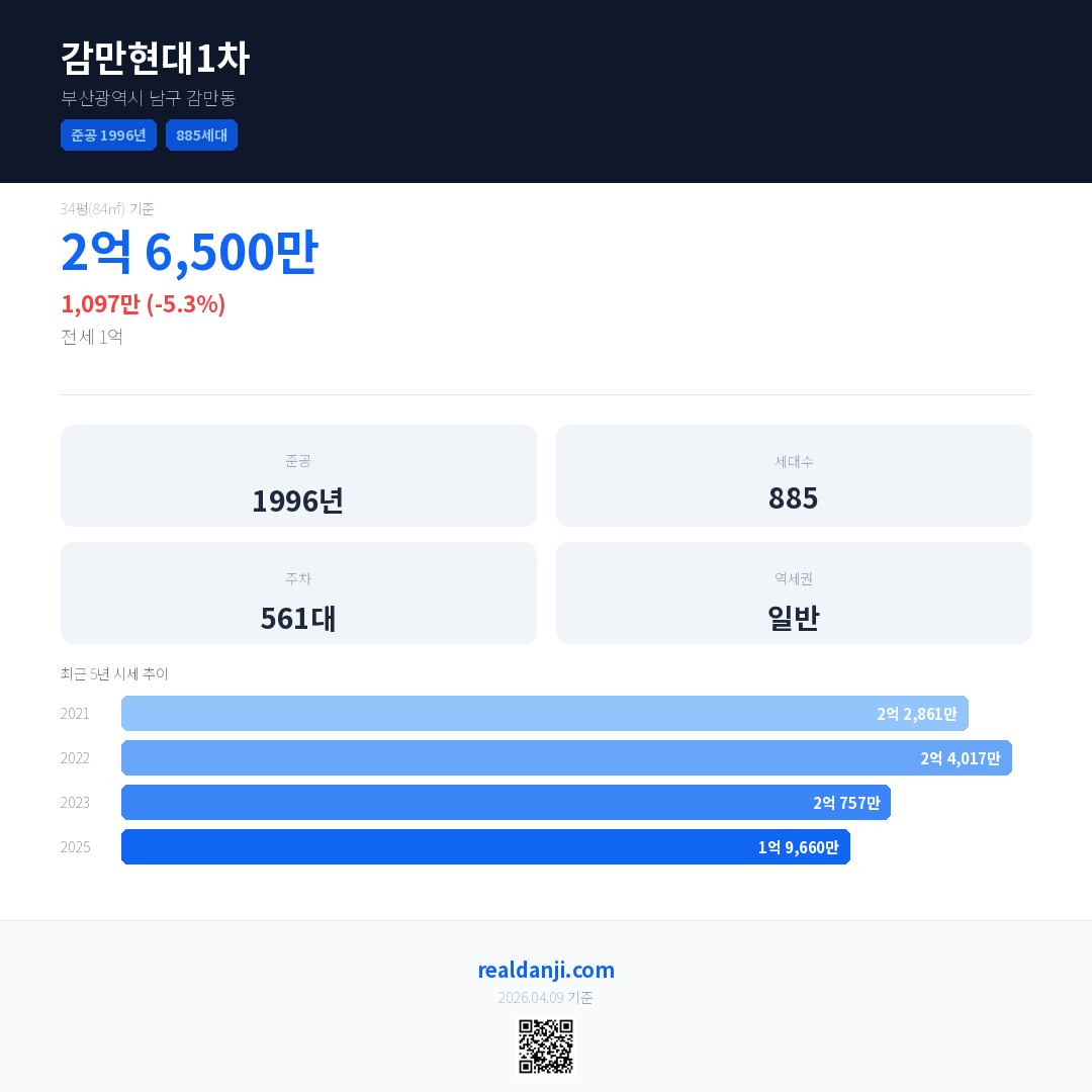 감만현대1차 최근 거래가는 2억 6,500만입니다. (2026-03)
