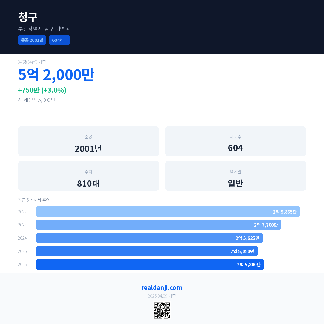 청구 국민평형 기준 2026년 평균 거래가는 2억 5,800만으로, 전년 대비 3.0% 상승 했습니다.