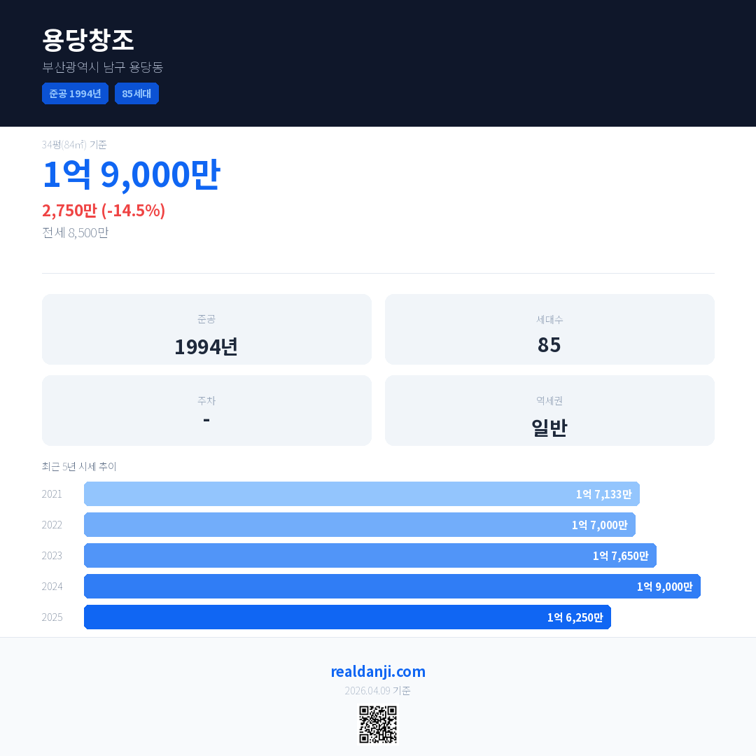 용당창조 국민평형 기준 2025년 평균 거래가는 1억 6,250만으로, 전년 대비 14.5% 하락 했습니다.
