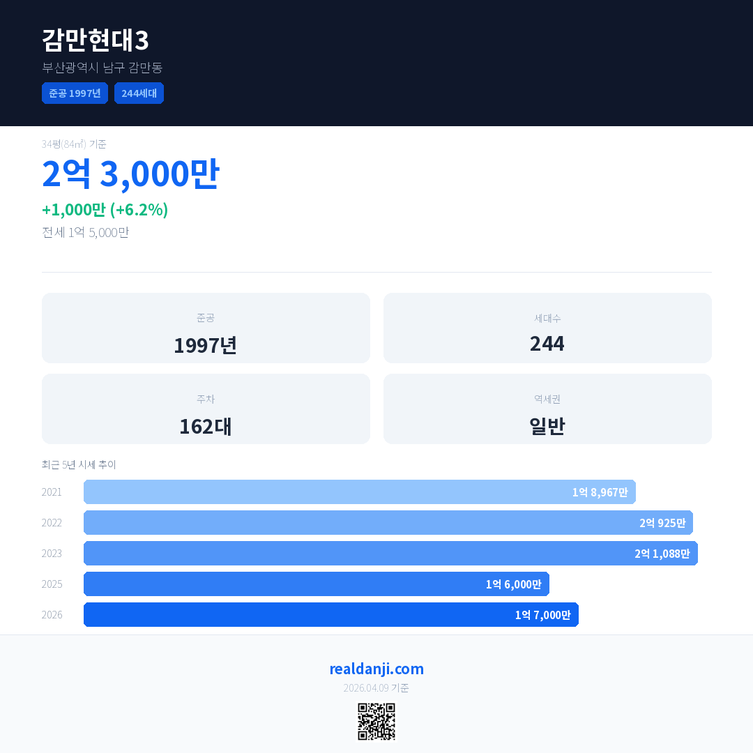 감만현대3 국민평형 기준 2026년 평균 거래가는 1억 7,000만으로, 전년 대비 6.2% 상승 했습니다.