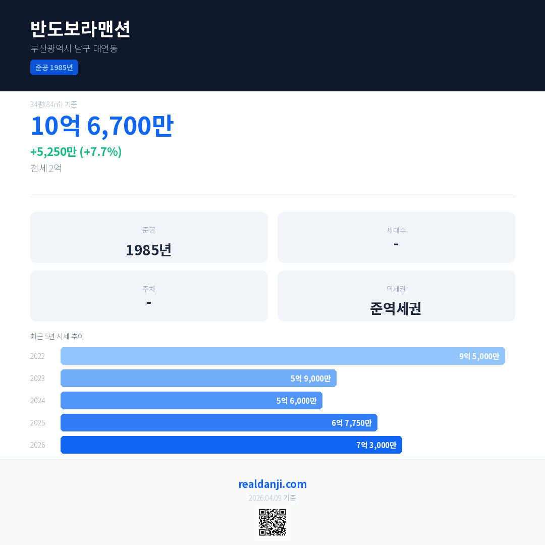 반도보라맨션 국민평형 기준 2026년 평균 거래가는 7억 3,000만으로, 전년 대비 7.7% 상승 했습니다.