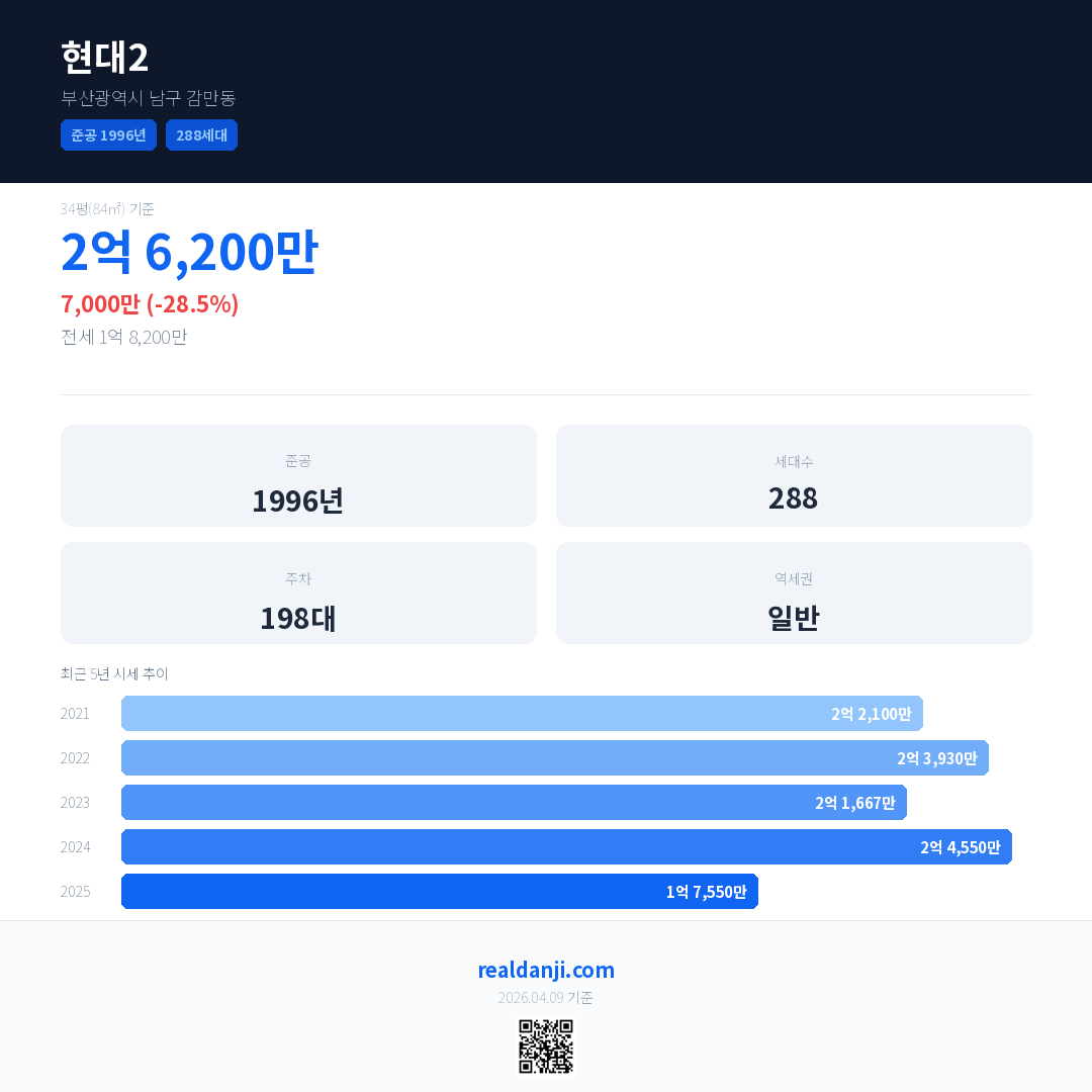 현대2 최근 거래가는 2억 6,200만입니다. (2025-12)