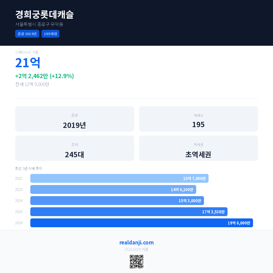 경희궁롯데캐슬 국민평형 기준 2026년 평균 거래가는 19억 6,000만으로, 전년 대비 12.9% 상승 했습니다.