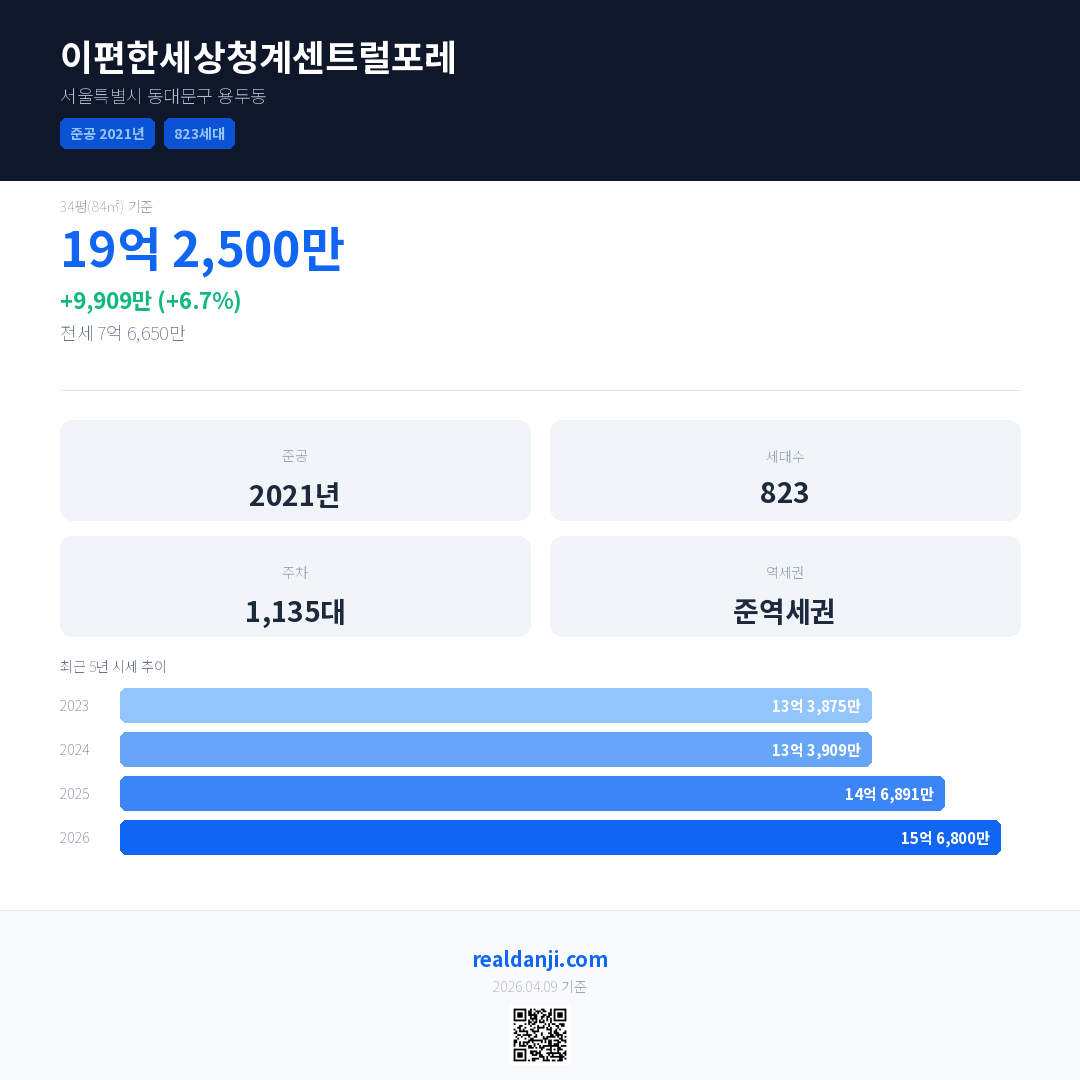 이편한세상청계센트럴포레 국민평형 기준 2026년 평균 거래가는 15억 6,800만으로, 전년 대비 6.7% 상승 했습니다.