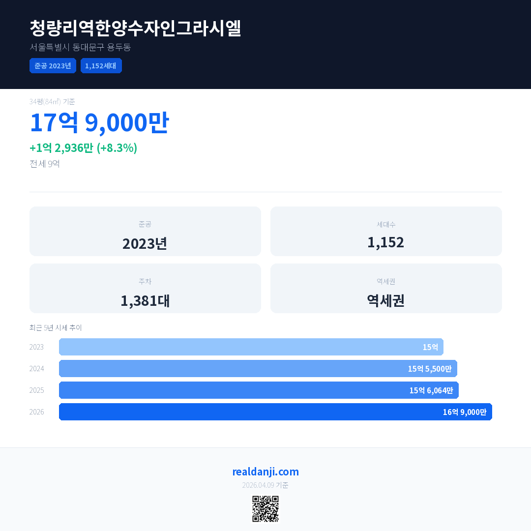 청량리역한양수자인그라시엘 국민평형 기준 2026년 평균 거래가는 16억 9,000만으로, 전년 대비 8.3% 상승 했습니다.