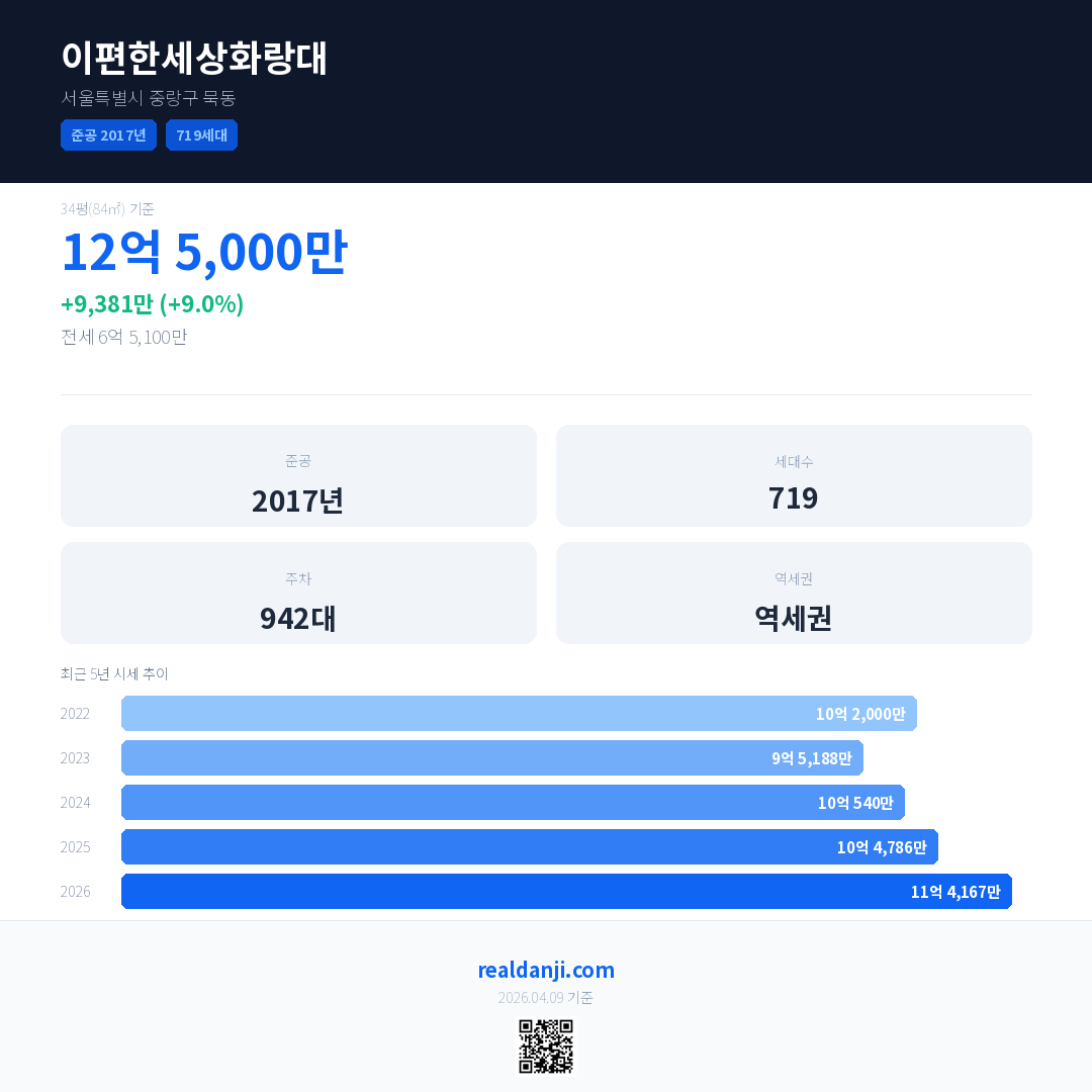 이편한세상화랑대 국민평형 기준 2026년 평균 거래가는 11억 4,167만으로, 전년 대비 9.0% 상승 했습니다.