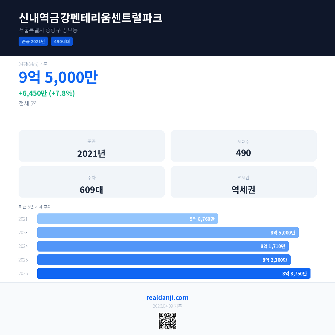 신내역금강펜테리움센트럴파크 최근 거래가는 9억 5,000만입니다. (2026-02)