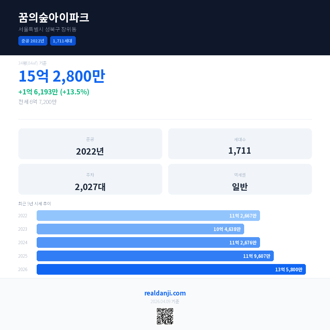 꿈의숲아이파크 최근 거래가는 15억 2,800만입니다. (2026-03)