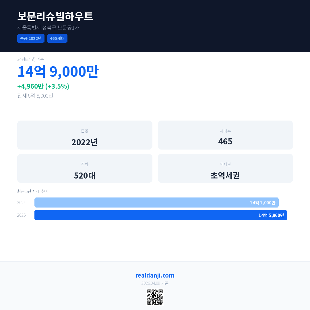 보문리슈빌하우트 국민평형 기준 2025년 평균 거래가는 14억 5,960만으로, 전년 대비 3.5% 상승 했습니다.