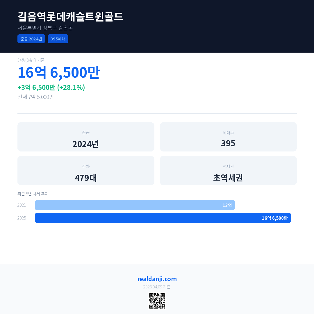 길음역롯데캐슬트윈골드 국민평형 기준 2025년 평균 거래가는 16억 6,500만으로, 전년 대비 28.1% 상승 했습니다.