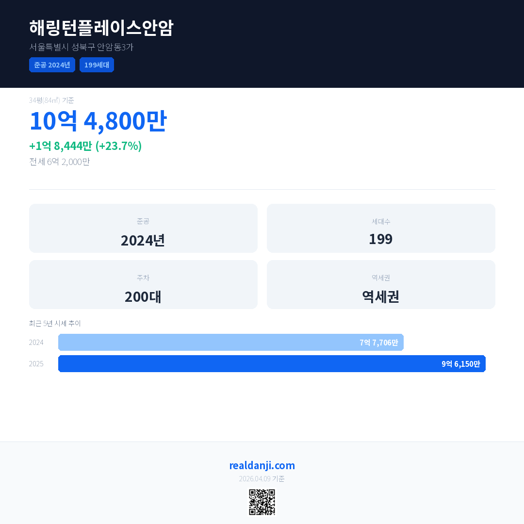 해링턴플레이스안암은(는) 2024년에 준공되었으며, 현재 2년차입니다. 총 199세대 규모입니다.